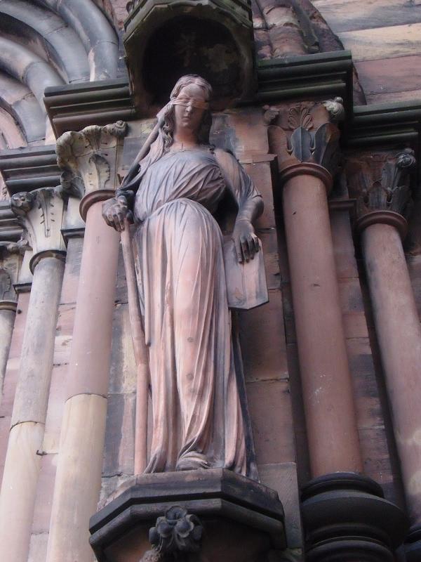 Fórum civil. No detalhe, a imagem de um urso (conta a lenda que o primeiro habitante da cidade foi um urso!). No alto do prédio, diversas estátuas representando personagens do Direito.
